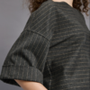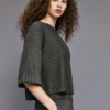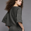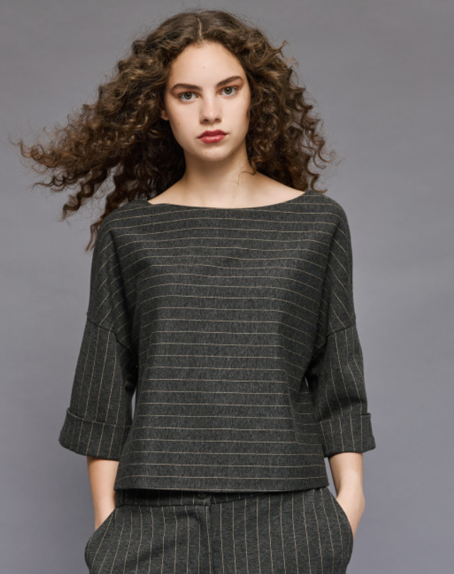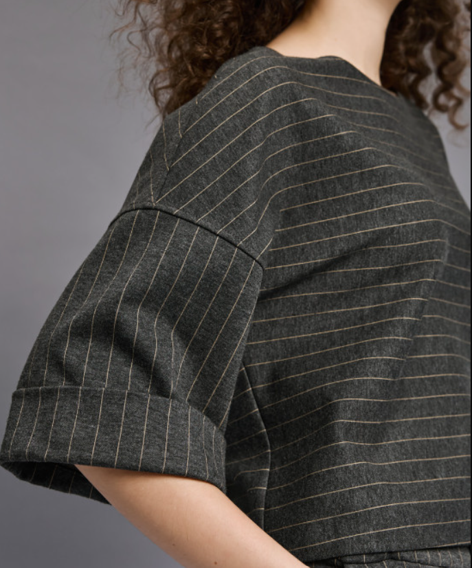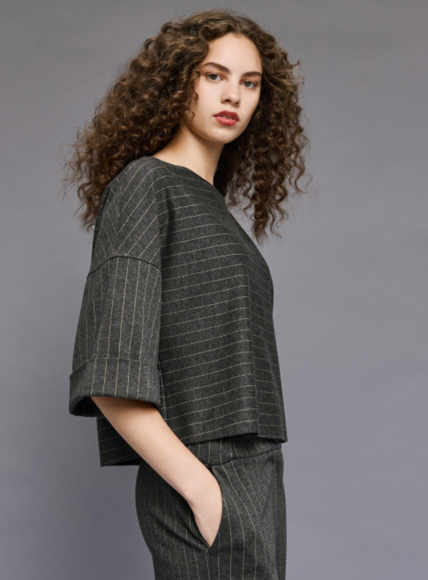 Ριγέ κοντή μπλούζα με χαμόγελο λαιμόκοψη και φαρδιά μανίκια 3/4 με γυρισμένο τελείωμα. Συνδυάστε με το αντίστοιχο παντελόνι από τη συλλογή μας για στιλάτες all-day εμφανίσεις.