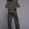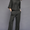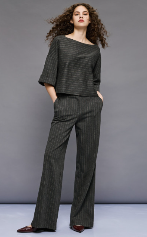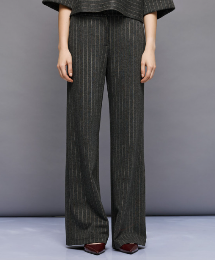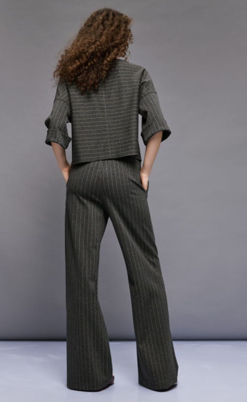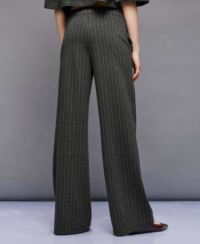 Ψηλόμεσο φαρδύ ριγέ παντελόνι με ελαστική μέση και κλείσιμο με φερμουάρ και κουμπί μπροστά. Συνδυάστε με την αντίστοιχη μπλούζα από τη συλλογή μας για κομψά και άνετα looks.