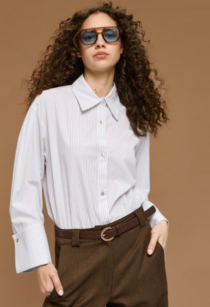 Μακρύ ριγέ πουκάμισο με μακριά μανίκια και φαρδιές μανσέτες. Διαθέτει γιακά και κλείσιμο με μεταλλικά κουμπιά μπροστά. Απαραίτητη προσθήκη σε κάθε κομψή γυναικεία γκαρνταρόμπα.