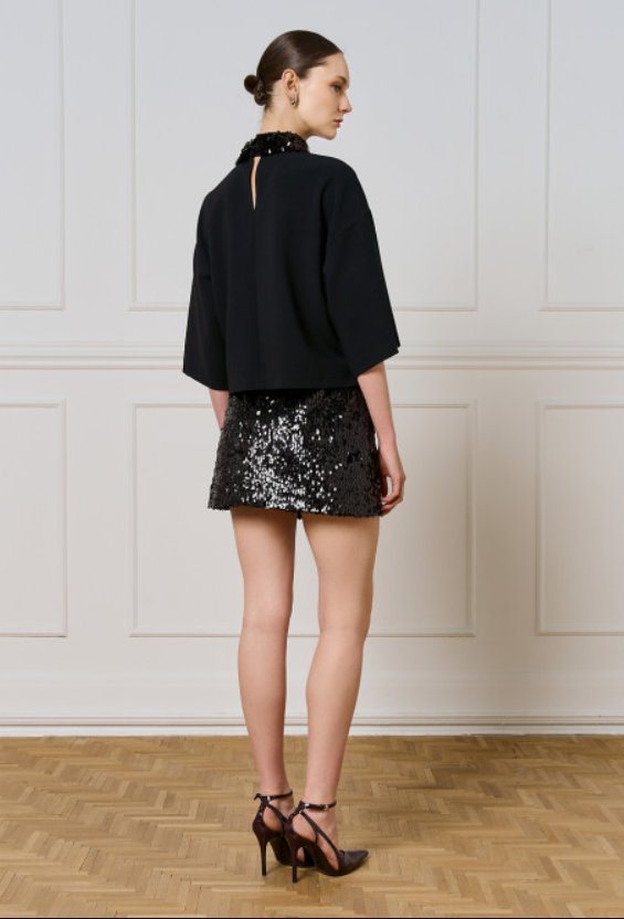 Μίνι φούστα παγιέτα με ενσωματωμένη φόδρα και κλείσιμο με κρυφό φερμουάρ πίσω. Συνδυάστε με την αντίστοιχη μπλούζα από τη συλλογή μας για λαμπερές βραδινές εμφανίσεις.
