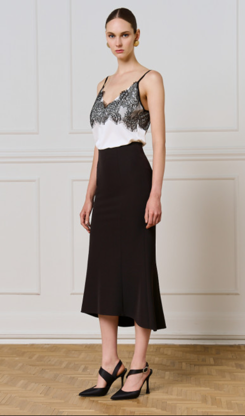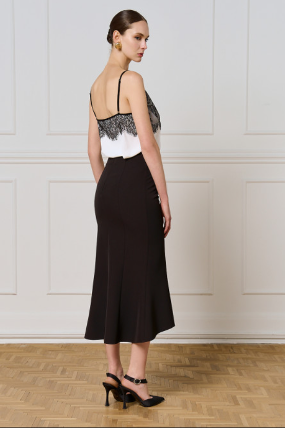 Μίντι φούστα με γκοντέ και διακοσμητικές ραφές. Διαθέτει κλείσιμο με φερμουάρ πίσω. Επιλέξτε τη για κομψές εμφανίσεις.