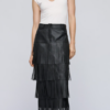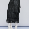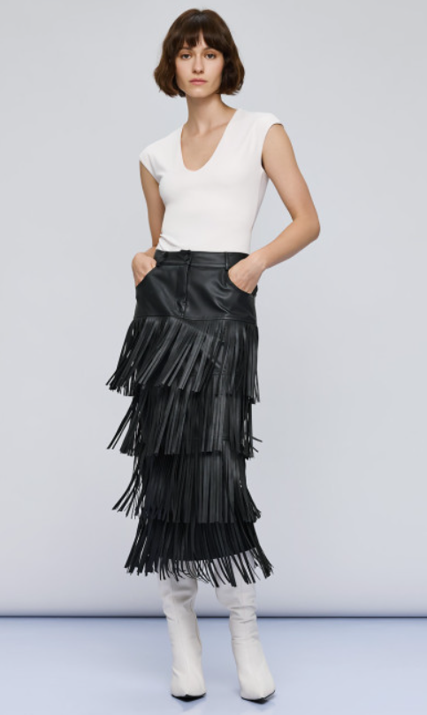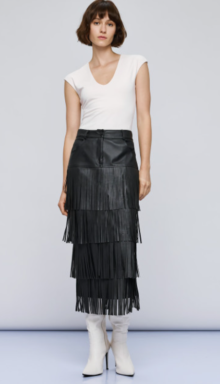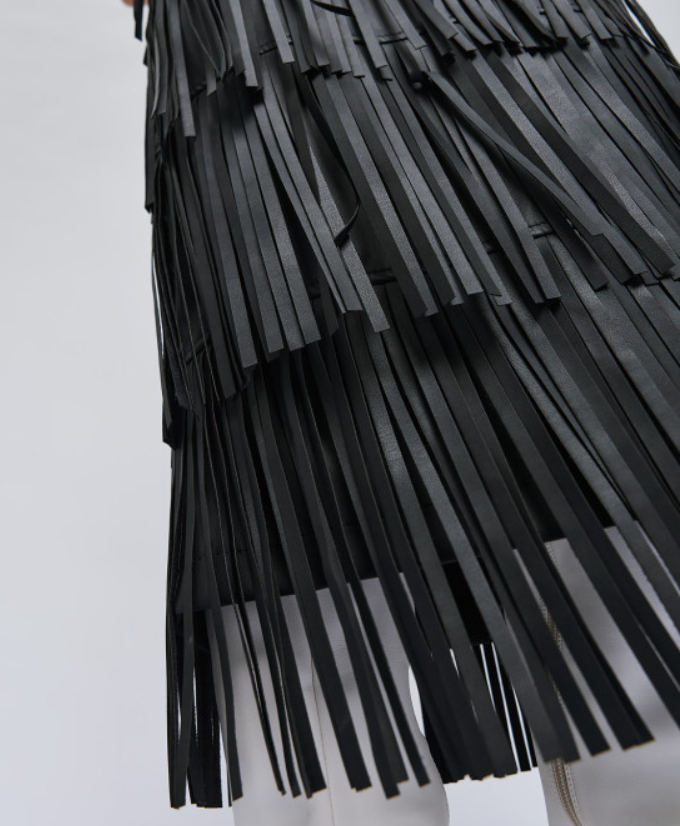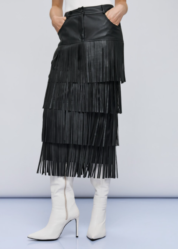 Μίντι φούστα όψης δέρματος με κρόσσια και πλαϊνές τσέπες. Διαθέτει θηλύκια ζώνης στη μέση και κλείσιμο με φερμουάρ και κουμπί μπροστά. Συνδυάστε με το αντίστοιχο τζάκετ από τη συλλογή μας για σύγχρονα και δυναμικά looks.