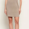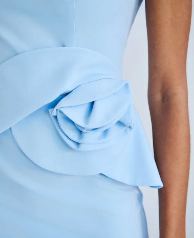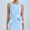 Μίνι αμάνικο φόρεμα με χαμόγελο λαιμόκοψη και άνοιγμα στην πλάτη. Διαθέτει διακοσμητικό βολάν που σχηματίζει λουλούδι στο μπροστινό μέρος και κλείσιμο με φερμουάρ πίσω.