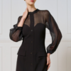 Μίνι φόρεμα με διαφάνεια στο πάνω μέρος και διακοσμητικές τσέπες με καπάκι. Διαθέτει διακοσμητικά κουμπιά μπροστά και αποσπώμενο γιακά και μανσέτες. Ιδανική επιλογή για ξεχωριστές εμφανίσεις με statement χαρακτήρα.