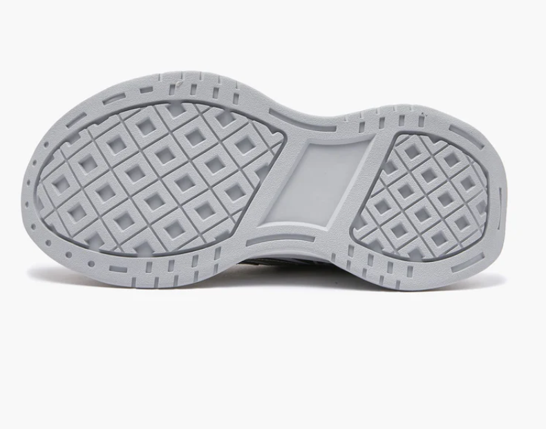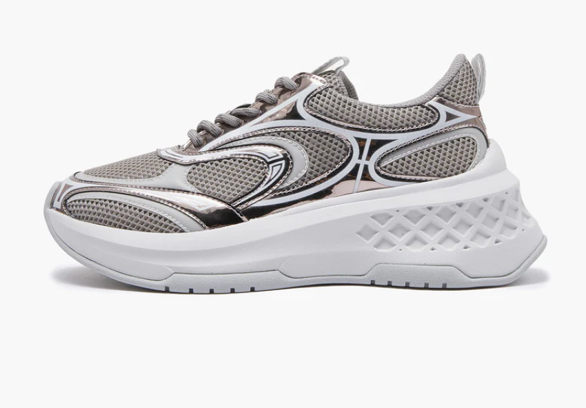 Lace-up running shoes in mirrored material and technical fabric with transparent PVC details and a two-tone lightweight EVA sole.