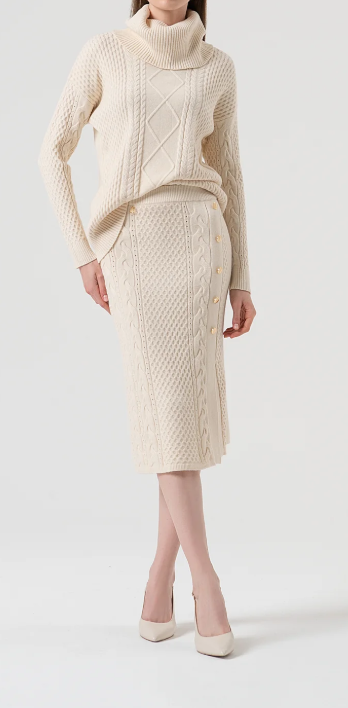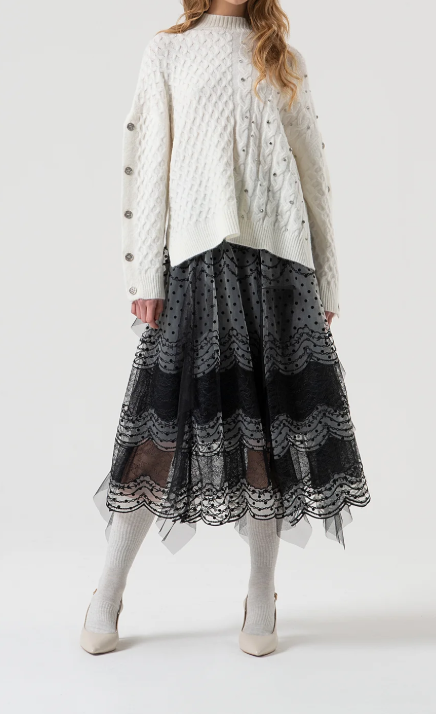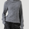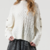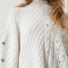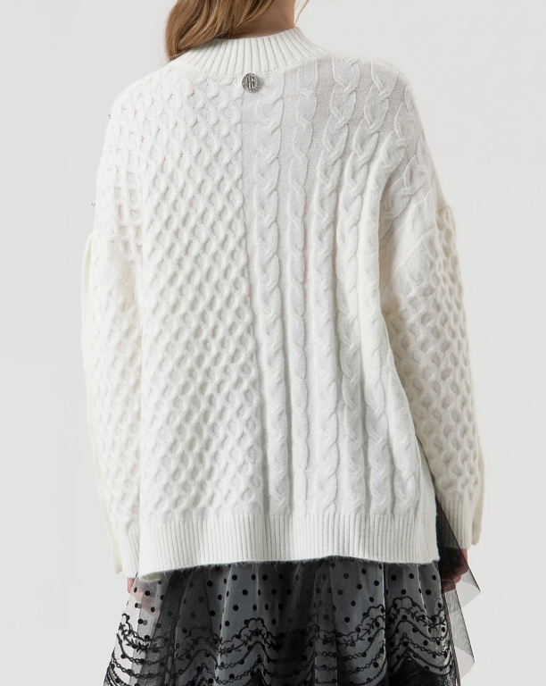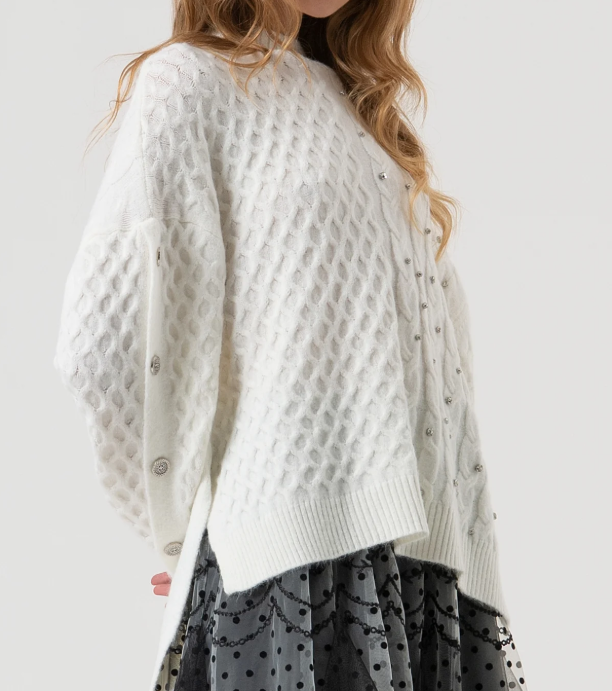 Knitwear over fit with plaits with shiny stones applied. High neck, back part longer than the front and long wide sleeves with buttons at the sides