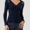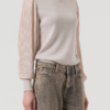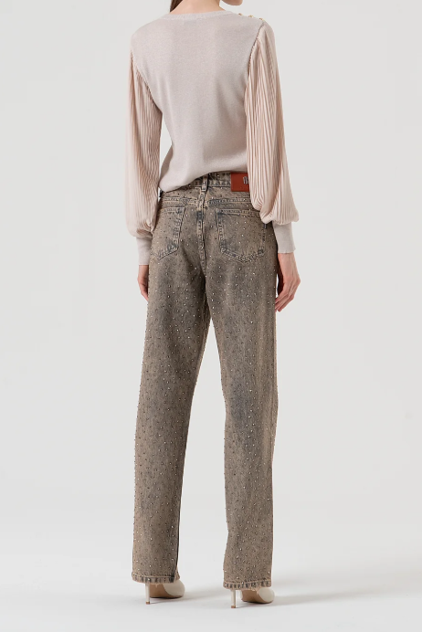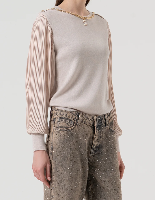 Knitwear regular fit made in wool and lurex. Round neck with jewel accessory applied and long balloon effect sleeves made in georgette with plissè effect