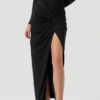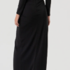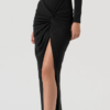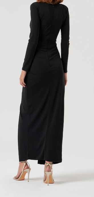 Long dress slim fit. Round neck, zip on the back, shoulder pads, long sleeves, bow at the waist and vent on the front