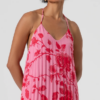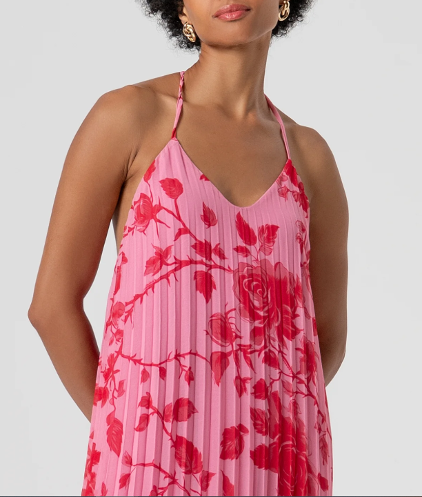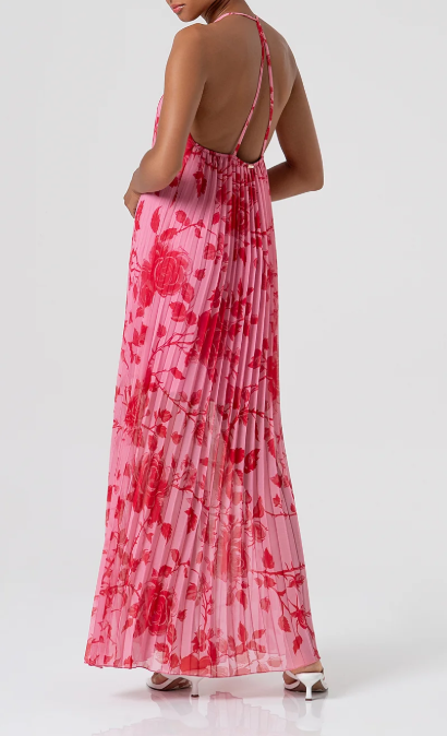 Long sleeveless dress made in georgette with plissè effect with flowery pattern. V-neck drop, naked back and thin braces