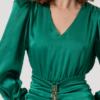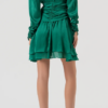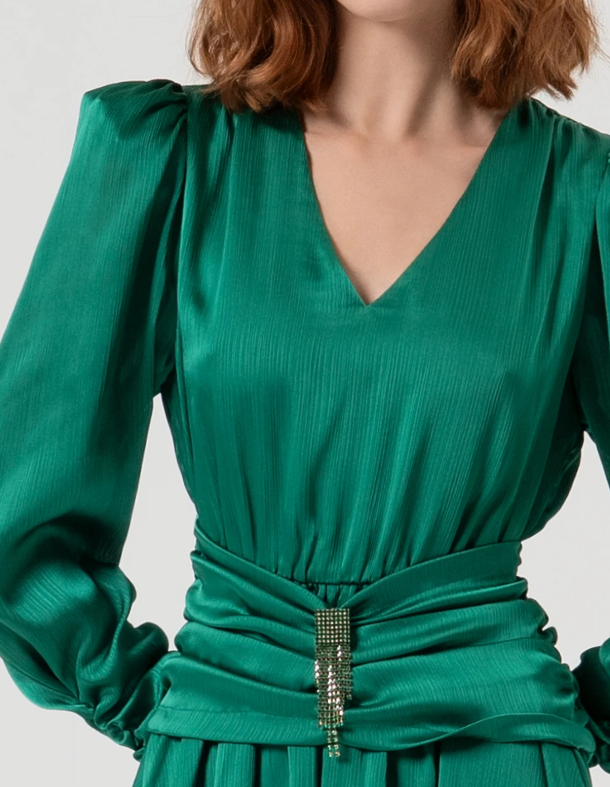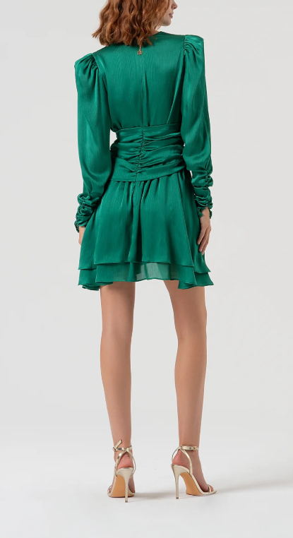 Mini dress regular fit made in soft fabric. V-neck drop, long puffball sleeves, sash at the waist with shiny applications and skirt with flounces