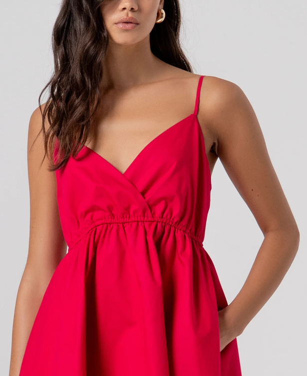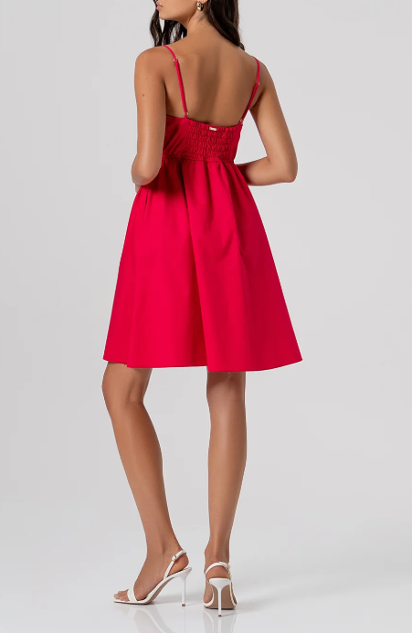 Mini sleeveless dress made cotton popeline. Criss crossed neckline, thin braces, smock stitch at the back and wide skirt with embroidery at the bottom