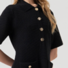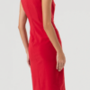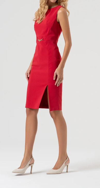 Sheath dress slim fit middle length. Boat neckline, zip on the back for opening, metallic accessory at the waist, vent at the back and sleeveless